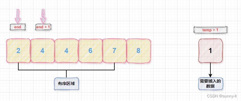 根据数组我们可以发现有序区域为 【2,4,6,7,8】 ,需要插入的数据为 【1】