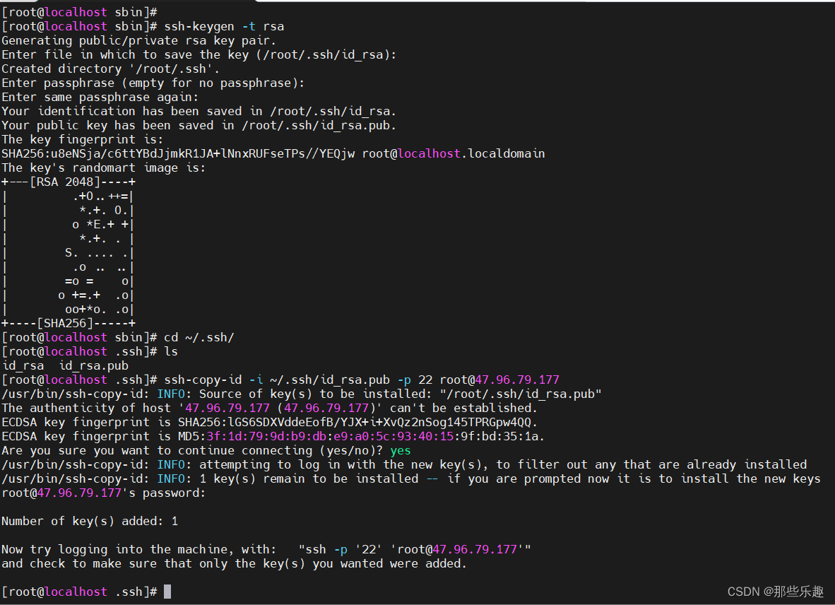 #在内网服务器A执行同步密匙命令,该命令会要求输入外网服务密码,直接输入就行#ssh-copy-id -i ~/.ssh/id_rsa.pub -p A的某远程端口 A的用户名@A的IP#or#ssh-copy-id -i .ssh/id_rsa.pub A的用户名@A的IP#or#ssh-copy-id A的用户名@A的IP#or#下面这一步是复制A的~/.ssh/id_rsa.pub内容到B的~/.ssh/authorized_keys中ssh-copy-id -i ~/.ssh/id_rsa.pub -p 22 root@47.96.79.177执行完成后,会在内网服务器A ~/.ssh/目录下出现known_hosts文件,里面是外网服务器的信息 同时此时登录到阿里云公网服务器B,也会在B服务器~/.ssh目录下看到authorized_keys文件,里面是内网服务器信息。
