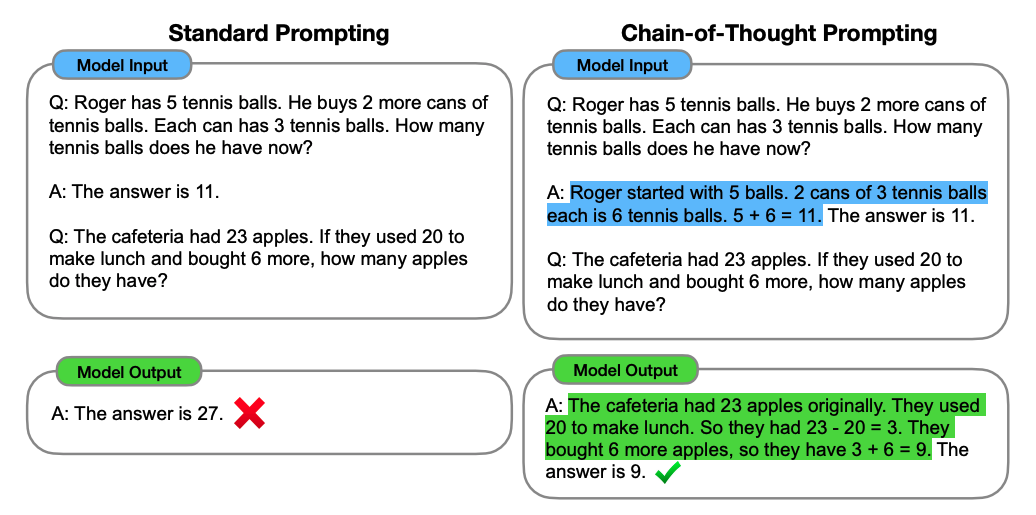 问:罗杰有5个网球,他又买了两盒网球,每盒有3个网球。他现在有多少网球?答:答案是11问:食堂有23个苹果,如果他们用掉20个后又买了6个。他们现在有多少个苹果?模型输出:答:答案是27 可以看到模型无法做出正确的回答。但如果说,我们给模型一些关于解题的思路,就像我们数学考试,都会把解题过程写出来再最终得出答案,不然无法得分。CoT 做的就是这件事,示例如下:CoT Prompting,模型输入: