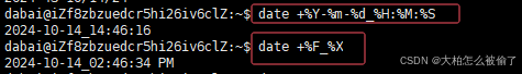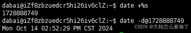 date -s // 设置当前时间,只有root权限才能设置,其他只能查看date -s 20241014 // 设置成 20241014,这样会把具体时间设置成空00:00:00date -s 01:01:01 // 设置具体时间,不会对日期做更改date -s "01:01:01 2024-10-14" // 这样可以设置全部时间date -s "01:01:01 20241014" // 这样可以设置全部时间date -s "2024-10-14 01:01:01" // 这样可以设置全部时间date -s "20241014 01:01:01" // 这样可以设置全部时间3.时间戳