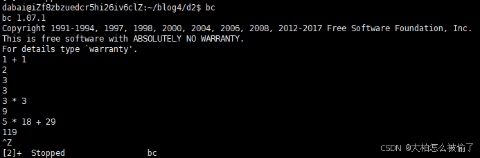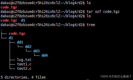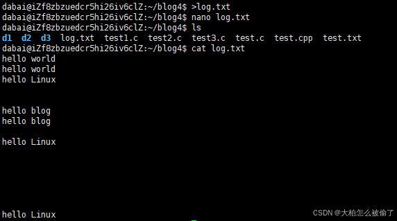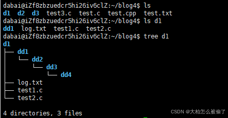dabai:用户名@... ... ... :主机名~/blog4/d2 :当前目录$ :命令行提示符这些都被统称为bash命令行。