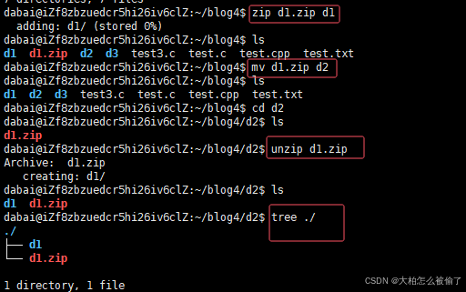 通过d1进行打包压缩,将d1.zip文件移到d2目录下面,然后在d2目录下面继续解压,解压后发现,!what!东西呢??只有一个d1目录死皮赖脸的跟过来了,d1下面的目录和文件都哪里去了??