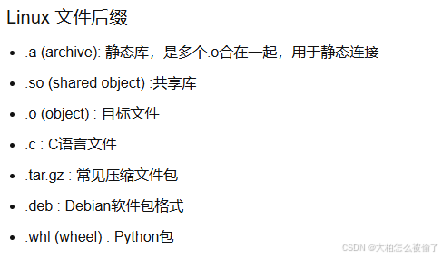 -c:建立一个压缩文件的参数指令(create的意思)-x:解开一个压缩文件的参数指令-t:查看tarfile里面的文件-z:是否同时具有gzip的属性?即是否需要gzip压缩?-j:是否同时具有bzip2的属性?即是否需要用bzip2压缩?-v:压缩的过程中显示文件!这个比较常用,但是不建议用在背景执行过程中-f:使用档名,请留意,在f之后要立即接档名,不要加参数-C:解压到指定目录在linux下,常见的后缀名有如下:
