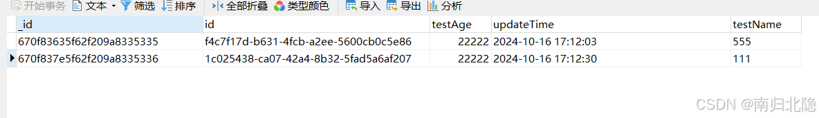 package com.kero99.pojo;import org.springframework.data.annotation.Id;import org.springframework.data.mongodb.core.mapping.Document;import org.springframework.data.mongodb.core.mapping.Field;import com.alibaba.fastjson.annotation.JSONField;@Document(collection = "测试集合")public class TestCollection {@Id @Field("id") private String id; @Field("testName") private String testName; @Field("testAge") private Integer testAge; @Field("updateTime") private String updateTime;public String getId() {return id;}public void setId(String id) {this.id = id;}public String getTestName() {return testName;}public void setTestName(String testName) {this.testName = testName;}public Integer getTestAge() {return testAge;}public void setTestAge(Integer testAge) {this.testAge = testAge;}public String getUpdateTime() {return updateTime;}public void setUpdateTime(String updateTime) {this.updateTime = updateTime;} } 2.实现增删改查mongdb操作