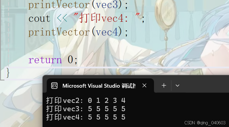 void printVector(vector<int>& vec){for (vector<int>::iterator it = vec.begin(); it != vec.end(); ++it){cout << *it << " ";}cout << endl;}int main(){vector<int> vec1;for (int i = 0; i < 5; ++i){vec1.push_back(i);}vector<int> vec2(vec1.begin(), vec1.end());vector<int> vec3(5, 5);vector<int> vec4(vec3);cout << "打印vec2: ";printVector(vec2);cout << "打印vec3: ";printVector(vec3);cout << "打印vec4: ";printVector(vec4);return 0;}
