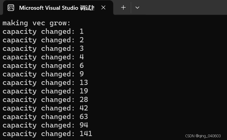 int main(){size_t sz;vector<int> vec;sz = vec.capacity();cout << "making vec grow:" << endl;for (int i = 0; i < 100; ++i){vec.push_back(i);if (sz != vec.capacity()){sz = vec.capacity();cout << "capacity changed: " << sz << endl;}}} 输出结果为: