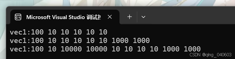 int main(){vector<int> vec1(5, 10);vector<int>::iterator it = vec1.begin();it = vec1.insert(it, 100);cout << "vec1:";for (it = vec1.begin(); it < vec1.end(); it++){cout << *it << " ";}cout << endl;vec1.insert(it, 2, 1000);it = vec1.begin();cout << "vec1:";for (it = vec1.begin(); it < vec1.end(); it++){cout << *it << " ";}cout << endl;vector<int> vec2(2, 10000);it = vec1.begin();vec1.insert(it + 2, vec2.begin(), vec2.end());cout << "vec1:";for (it = vec1.begin(); it < vec1.end(); it++){cout << *it << " ";}cout << endl;return 0;} 输出结果为: