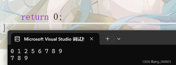 int main(){vector<int> vec = { 0,1,2,3,4,5,6,7,8,9 };vector<int>::iterator it = vec.erase(vec.begin() + 3);// 删除值为3的元素it = vec.erase(it);// 删除值为4的元素for (int i = 0; i < vec.size(); i++){cout << vec[i] << " ";}cout << endl;it = vec.erase(vec.begin(), vec.begin() + 5);for (int i = 0; i < vec.size(); i++){cout << vec[i] << " ";}cout << endl;return 0;} 输出结果为: