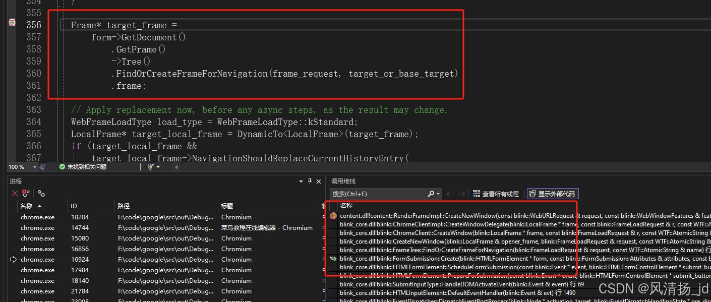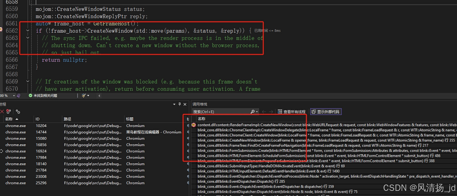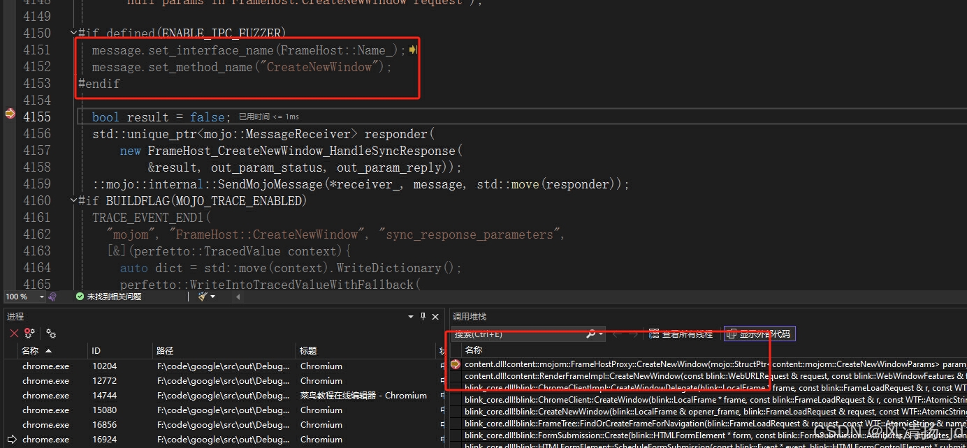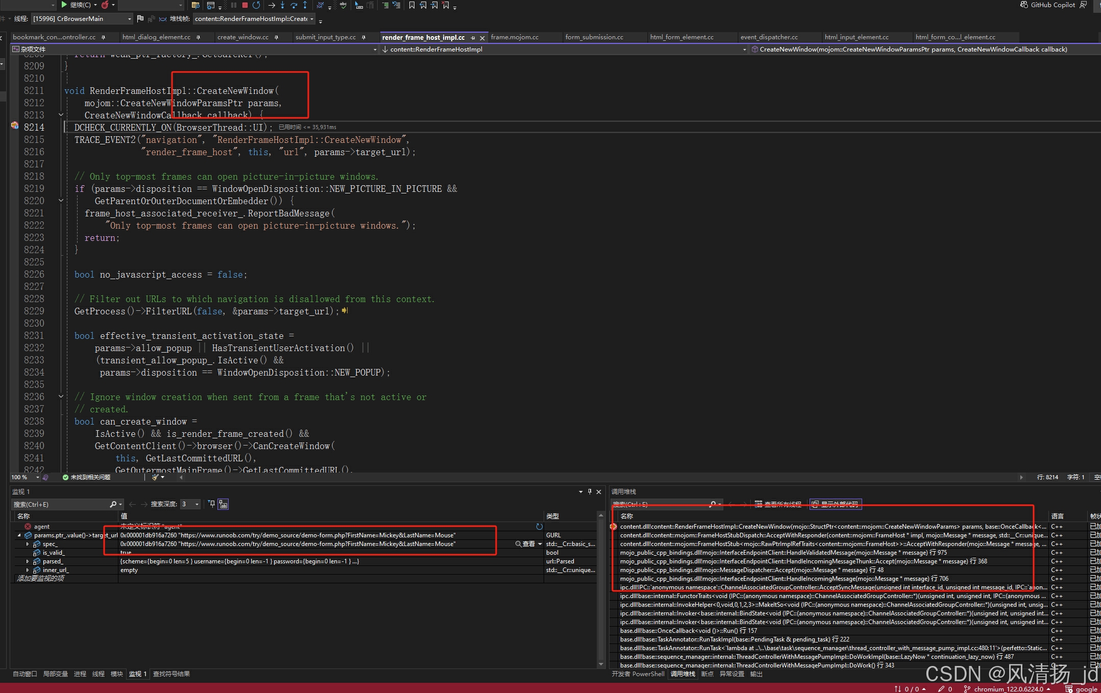 @3content.dll!content::RenderFrameImpl::CreateNewWindow(const blink::WebURLRequest & request, const blink::WebWindowFeatures & features, const blink::WebString & frame_name, blink::WebNavigationPolicy policy, network::mojom::WebSandboxFlags sandbox_flags, const std::__Cr::basic_string<char,std::__Cr::char_traits<char>,std::__Cr::allocator<char>> & session_storage_namespace_id, bool & consumed_user_gesture, const std::__Cr::optional<blink::Impression> & impression, const std::__Cr::optional<blink::WebPictureInPictureWindowOptions> & pip_options, const blink::WebURL & base_url) 行 6562C++已加载符号。@2 blink_core.dll!blink::ChromeClientImpl::CreateWindowDelegate(blink::LocalFrame * frame, const blink::FrameLoadRequest & r, const WTF::AtomicString & name, const blink::WebWindowFeatures & features, network::mojom::WebSandboxFlags sandbox_flags, const std::__Cr::basic_string<char,std::__Cr::char_traits<char>,std::__Cr::allocator<char>> & session_storage_namespace_id, bool & consumed_user_gesture) 行 342C++已加载符号。 @1blink_core.dll!blink::ChromeClient::CreateWindow(blink::LocalFrame * frame, const blink::FrameLoadRequest & r, const WTF::AtomicString & frame_name, const blink::WebWindowFeatures & features, network::mojom::WebSandboxFlags sandbox_flags, const std::__Cr::basic_string<char,std::__Cr::char_traits<char>,std::__Cr::allocator<char>> & session_storage_namespace_id, bool & consumed_user_gesture) 行 88C++已加载符号。 @0blink_core.dll!blink::CreateNewWindow(blink::LocalFrame & opener_frame, blink::FrameLoadRequest & request, const WTF::AtomicString & frame_name) 行 355C++已加载符号。>blink_core.dll!blink::FrameTree::FindOrCreateFrameForNavigation(blink::FrameLoadRequest & request, const WTF::AtomicString & name) 行 217C++已加载符号。 3.4)、RenderFrameImpl::CreateNewWindow 调用frame_host->CreateNewWindow 给主进程发送CreateNewWindow的mojom消息。
