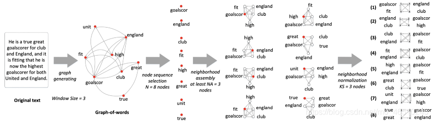 在下面的模型中,它在原始文本上滑动一个三个单词的窗口,以创建单词图。这张图表示三个词范围内的词共现。然后,它根据每个节点的秩(节点的连接数)从图中选择节点。对于每个节点,它使用广度优先搜索查找包含该节点和另外四个节点的4个节点的子图。子图将是有序的,这样卷积可以一致地应用到所有子图。