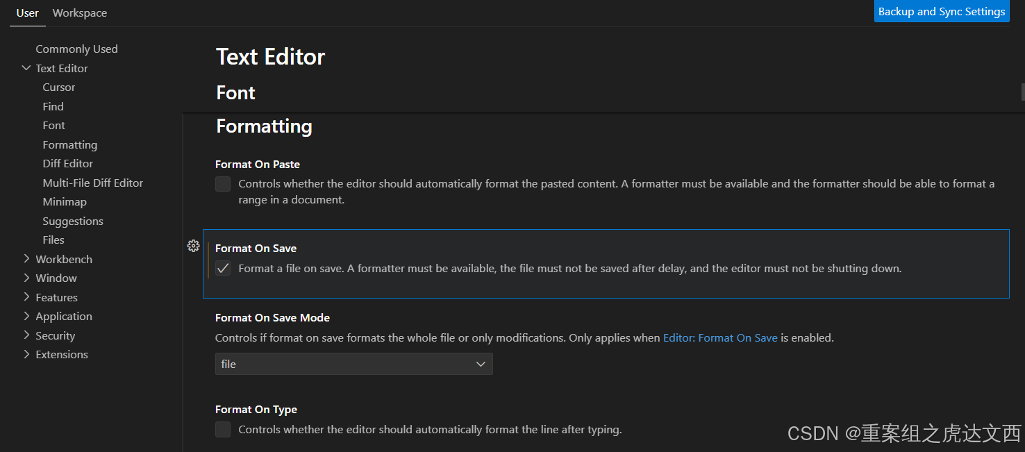 最后一个Format on type是键入格式化,比如键入;就会格式化。