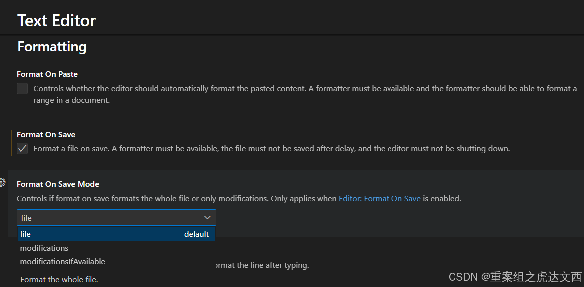 选择此选项保存文件时,VS Code 会格式化整个文件。即使你只修改了部分内容,保存时所有内容都会被格式化。