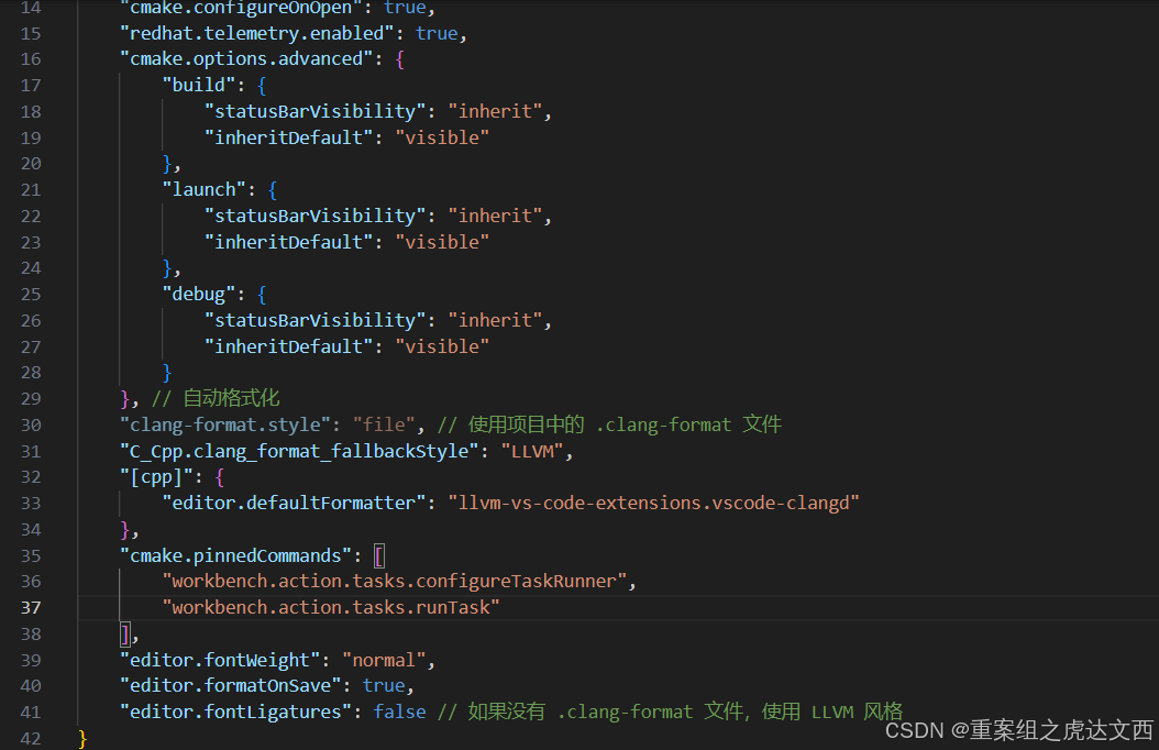 在设置好C/C++ Extension Pack之后,最后一步就是配置clang-format文件了,打开settings.json文件可以看到如果不配置clang-format文件,clang-format会使用默认的风格格式化代码。