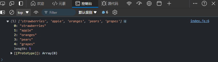 在绝大数情况下,可以直接写一个中括号来声明数组,这次来写一下一些水果,将打印的内容改为 fruits