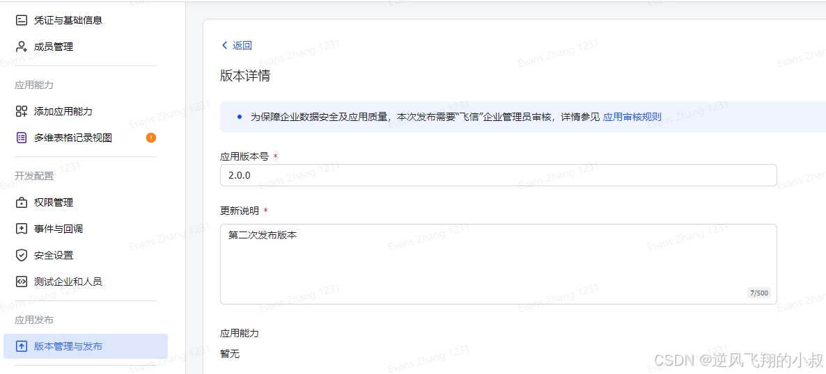 点击创建版本,参照下面的格式要求填写,提交之后需要等待飞书管理员审核通过。
