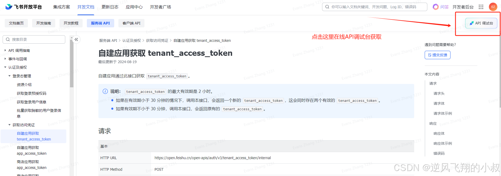 点击开始调试按钮,请求成功后,就能看到本次请求的tenant_access_token结果,如果需要user_access_token的话,点击下面的获取按钮即可,需要注意的是,token的最大有效期是2小时;