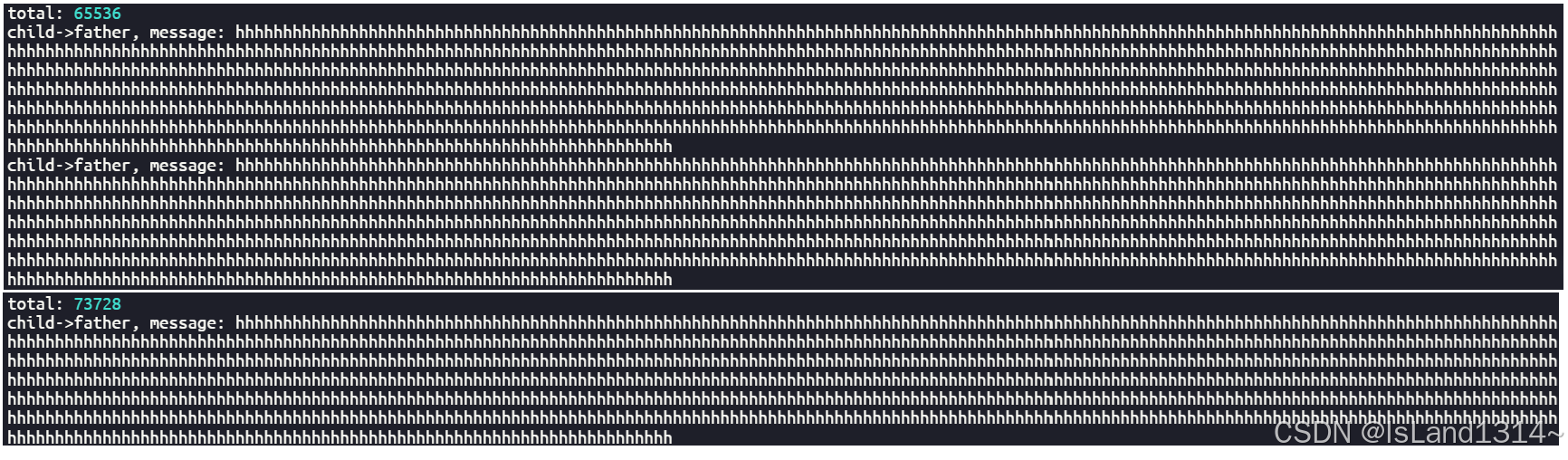 else if (id == 0){ int cnt = 0, total = 0; while (true) { close(fds[0]); std::string message = "h"; // fds[1] total += ::write(fds[1], message.c_str(), message.size()); cnt++; std::cout << "total: " << total << std::endl; // 最后写到 65536 个字节 sleep(2); break; // 写端关闭 } exit(0);}else{ // 父进程 // 3. 关闭不需要的 fd, 关闭 write close(fds[1]); char buffer[1024]; while (true) { sleep(1); ssize_t n = ::read(fds[0], buffer, 1024); if (n > 0) { buffer[n] = 0; std::cout << "child->father, message: " << buffer << std::endl; } else if (n == 0) { std::cout << "n: " << n << std::endl; std::cout << "child quit??? me too " << std::endl; break; } std::cout << std::endl; } pid_t rid = waitpid(id, nullptr, 0); std::cout << "father wait chile success" << rid << std::endl;} 运行如下: