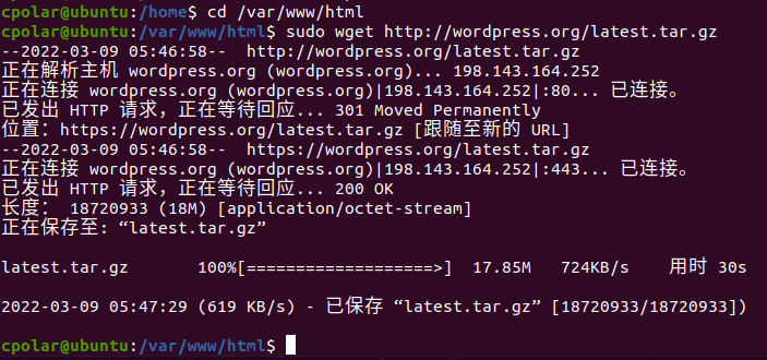 cd /var/www/html 在该目录下输入命令,下载WordPress的压缩包