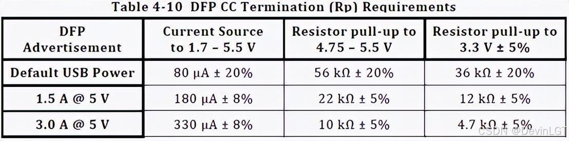 Type-C spec定义了DFP在不同模式下,在CC pin要供多大的电流或是要用多大的上拉电阻Rp阻值。
