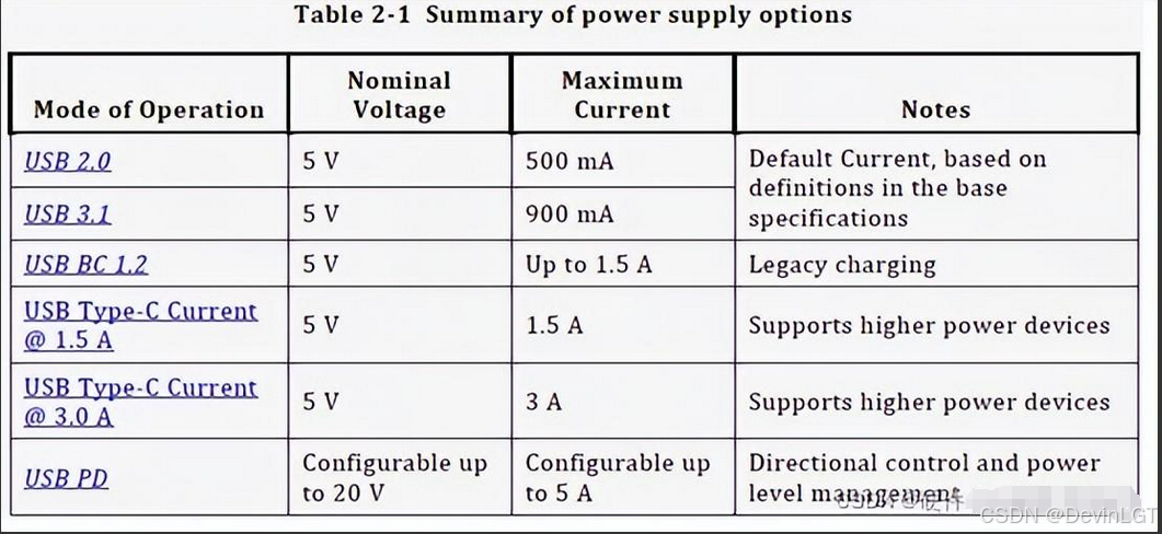下图展示了每个USB标准所能提供的供电能力。纯type C端口可提供5V/3A的供电能力。如果配合PD协议,供电能力可以达到更高(USB pd协议通过CC引脚通信)。