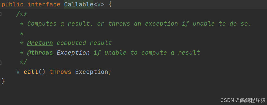 Callable 接口就和java.lang包下的Runnable接口的定位差不多,只不过给了我们一个返回值,在Runnable接口要重写run方法,而在Callable接口中要重写call方法。