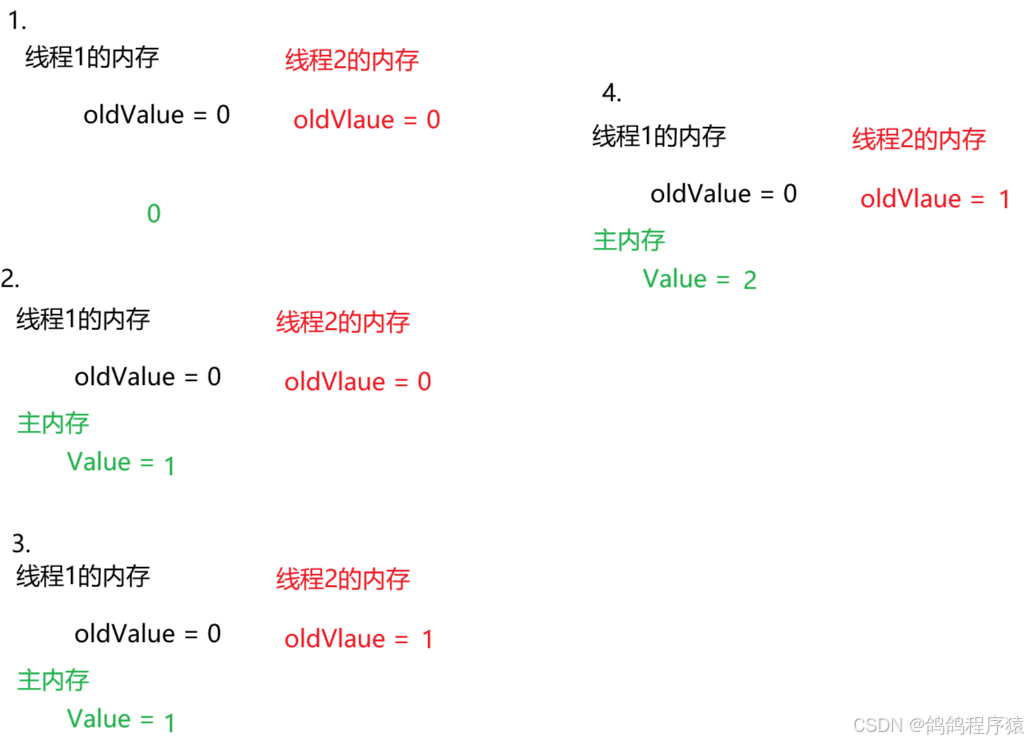 两个线程都读取 value 的值到 oldValue 中。 (oldValue 是一个局部变量, 在栈上. 每个线程有自己的栈)线程1 先执行 CAS 操作. 由于 oldValue 和 value 的值相同, 直接进行对 value 赋值。线程2 再执行 CAS 操作, 第一次 CAS 的时候发现 oldValue 和 value 不相等, 不能进行赋值。因此需要进入循环。在循环里重新读取 value 的值赋给 oldValue。线程2 接下来第二次执行 CAS, 此时 oldValue 和 value 相同, 于是直接执行赋值操作。线程1 和 线程2 返回各自的 oldValue 的值即可。