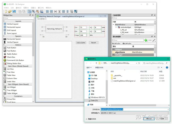 这个 xxx_Ui.py文件,忽略其.py后缀,名字是「matchingNetworkDesigner_Ui」,它的代码主体是一个类,类的名字是「Ui_MainWindow」,类里定义了GUI的各个组件及其格式、位置等等。