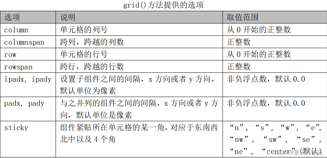 grid 表格布局,采用表格结构组织组件。子组件的位置由行和列的单元格来确定,并
