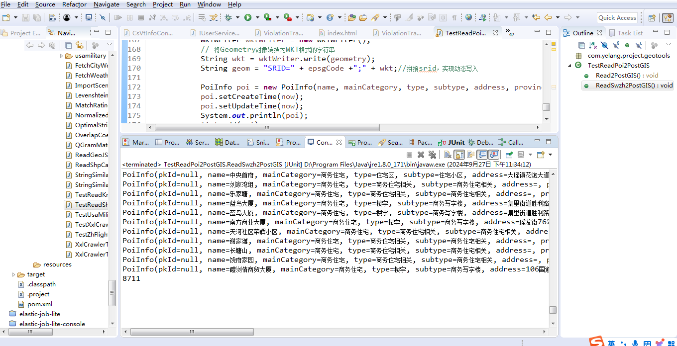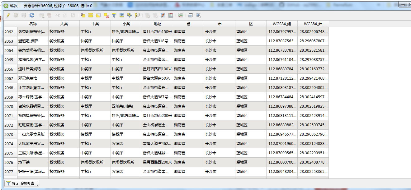 String mainCategory = (String) mainCategoryProperty.getValue();;String [] splitMainCategory = mainCategory.split(";");String type = "";String subtype ="";//商务住宅的POI要特殊处理、从大类中分解出中类和小类if(splitMainCategory.length == 3) { mainCategory = splitMainCategory[0]; type = splitMainCategory[1]; subtype = splitMainCategory[2];}else if(splitMainCategory.length > 3) { mainCategory = splitMainCategory[0]; type = splitMainCategory[1]; for(int i = 2;i <splitMainCategory.length;i++ ) { subtype += splitMainCategory[i]; }}else { Property typeProperty = feature.getProperty("中类"); type = (String)typeProperty.getValue(); Property subtypeProperty = feature.getProperty("小类"); subtype = subtypeProperty != null ? (String)subtypeProperty.getValue() : "";} 3、实际运行结果