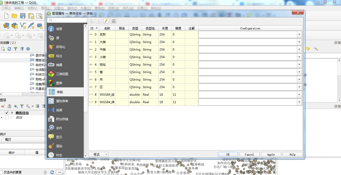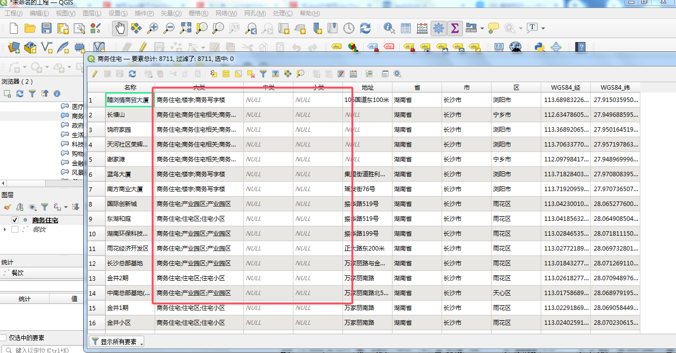 在商务住宅的POI数据中,所有的分类数据都集中到了大类这个字段,而另外两个字段比如中类和小类则是空的。其它的数据都是正确的,因此我们需要对商务住宅这个大类的数据进行简单的分拆。然后对应到具体的大类、中类、小类上面。