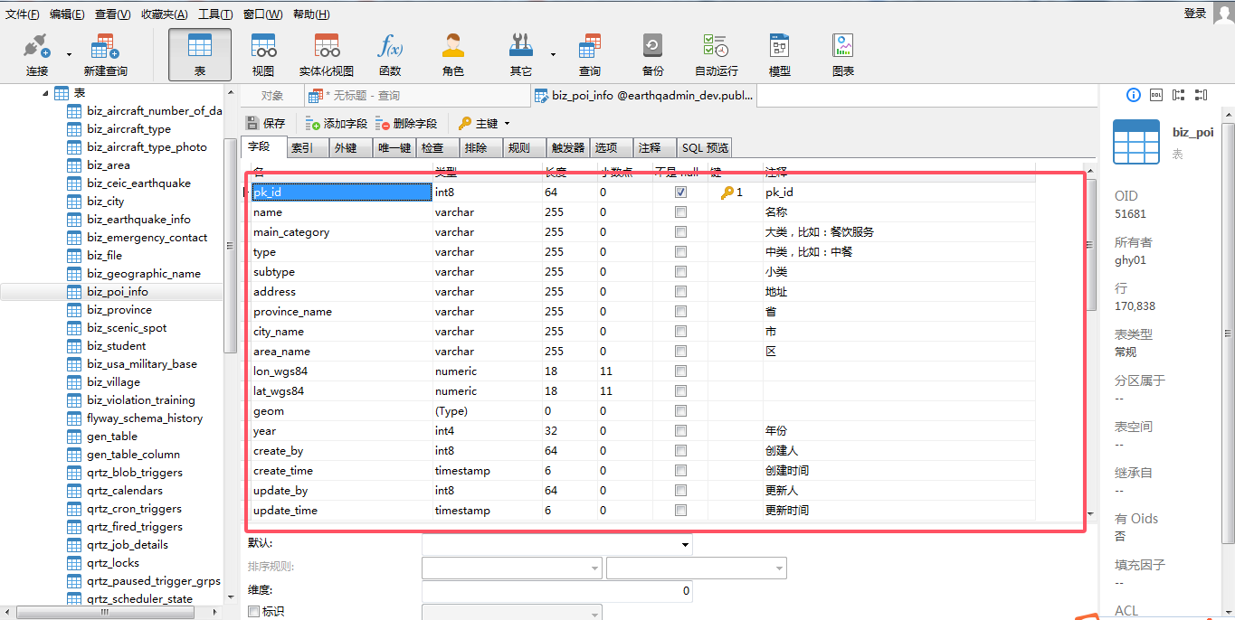 CREATE TABLE "public"."biz_poi_info" ( "pk_id" int8 NOT NULL, "name" varchar(255) COLLATE "pg_catalog"."default", "main_category" varchar(255) COLLATE "pg_catalog"."default", "type" varchar(255) COLLATE "pg_catalog"."default", "subtype" varchar(255) COLLATE "pg_catalog"."default", "address" varchar(255) COLLATE "pg_catalog"."default", "province_name" varchar(255) COLLATE "pg_catalog"."default", "city_name" varchar(255) COLLATE "pg_catalog"."default", "area_name" varchar(255) COLLATE "pg_catalog"."default", "lon_wgs84" numeric(18,11), "lat_wgs84" numeric(18,11), "geom" "public"."geometry", "year" int4, "create_by" int8, "create_time" timestamp(6), "update_by" int8, "update_time" timestamp(6), CONSTRAINT "pk_biz_poi_info" PRIMARY KEY ("pk_id"));CREATE INDEX "idx_biz_poi_info_geom" ON "public"."biz_poi_info" USING gist ( "geom" "public"."gist_geometry_ops_2d");COMMENT ON COLUMN "public"."biz_poi_info"."pk_id" IS 'pk_id';COMMENT ON COLUMN "public"."biz_poi_info"."name" IS '名称';COMMENT ON COLUMN "public"."biz_poi_info"."main_category" IS '大类,比如:餐饮服务';COMMENT ON COLUMN "public"."biz_poi_info"."type" IS '中类,比如:中餐';COMMENT ON COLUMN "public"."biz_poi_info"."subtype" IS '小类';COMMENT ON COLUMN "public"."biz_poi_info"."address" IS '地址';COMMENT ON COLUMN "public"."biz_poi_info"."province_name" IS '省';COMMENT ON COLUMN "public"."biz_poi_info"."city_name" IS '市';COMMENT ON COLUMN "public"."biz_poi_info"."area_name" IS '区';COMMENT ON COLUMN "public"."biz_poi_info"."year" IS '年份';COMMENT ON COLUMN "public"."biz_poi_info"."create_by" IS '创建人';COMMENT ON COLUMN "public"."biz_poi_info"."create_time" IS '创建时间';COMMENT ON COLUMN "public"."biz_poi_info"."update_by" IS '更新人';COMMENT ON COLUMN "public"."biz_poi_info"."update_time" IS '更新时间';COMMENT ON TABLE "public"."biz_poi_info" IS '保存兴趣点信息表'; 以上就是对POI数据进行简单的介绍,以及对POI数据的时空数据表的物理模型和表结构进行了讲解。请注意,在进行空间数据库设计的时候,请务必安装PostGIS的扩展,否则上面的SQL将无法运行,为了在后面的空间分析和查询的服务中发挥出更好的性能,我们给Geometry字段建立空间索引。