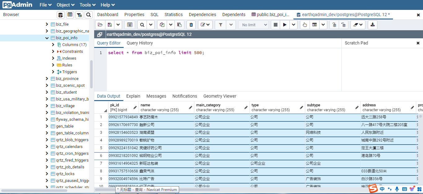 可以看到数据已经成功的加载到内存中,等待批量录入的空间数据库中。下面我们来看下空间数据库中的情况。 在PgAdmin中执行查询语句可以看到如下的结果: