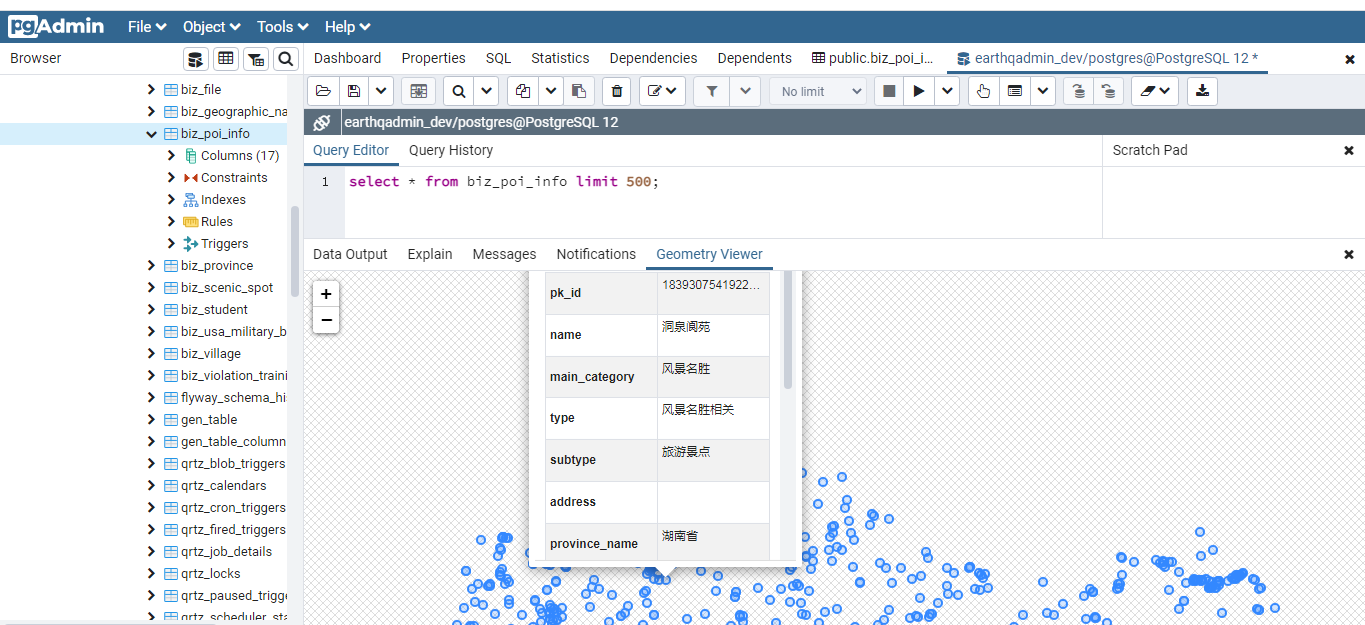 如果能看到以上结果说明,数据已经成功的插入到数据库中,在PgAdmin当中,还可以直接看到空间数据的分布,可以点击查看属性信息。