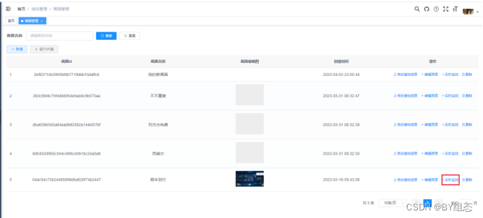 我们提供的组态插件只有编辑器和实时监控画面,并没有画面的列表功能,该功能需要你们自己去做,主要是操作表stage_data的增删改查,界面参考如下,该界面示例以【若依前后端分离项目-前端项目】为例去做的列表页面。若依项目地址http://doc.ruoyi.vip/