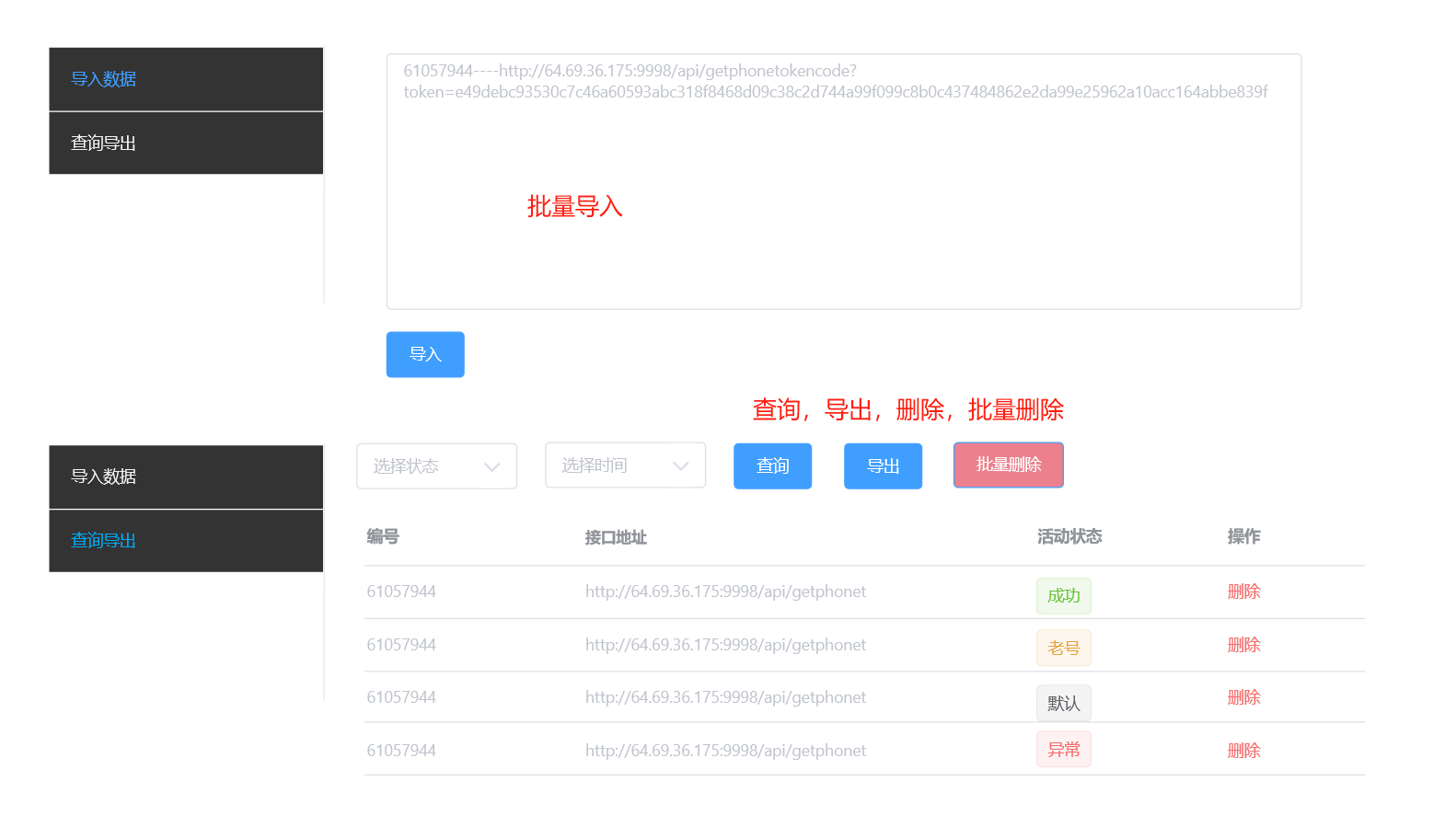 提供标记接口,他使用完会标记这条数据的状态(1成功,2老号,3异常)