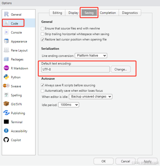 12、在“code”的“saving”中将文本编码格式换成“UTF-8”