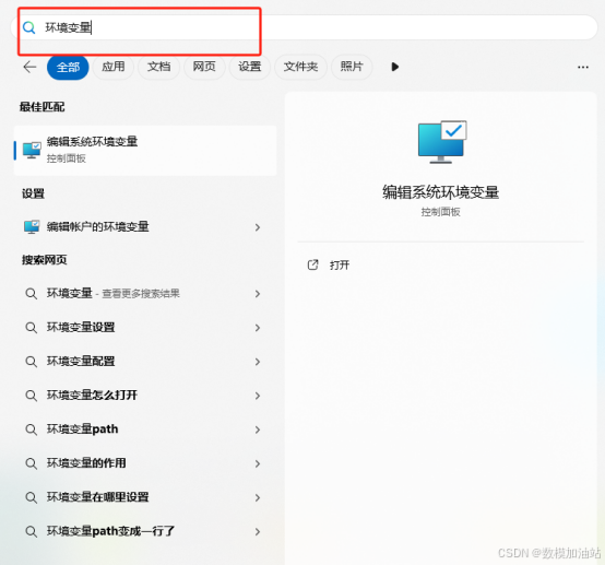 2、打开菜单,搜索环境变量,点击“编辑系统环境变量”