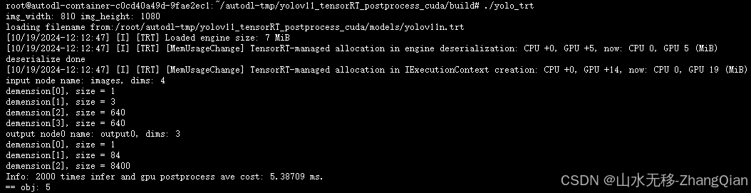 std::string OnnxFile = "/root/autodl-tmp/yolov11_tensorRT_postprocess_cuda/models/yolov11n.onnx"; std::string SaveTrtFilePath = "/root/autodl-tmp/yolov11_tensorRT_postprocess_cuda/models/yolov11n.trt"; cv::Mat SrcImage = cv::imread("/root/autodl-tmp/yolov11_tensorRT_postprocess_cuda/images/test.jpg"); int img_width = SrcImage.cols; int img_height = SrcImage.rows; std::cout << "img_width: " << img_width << " img_height: " << img_height << std::endl; CNN YOLO(OnnxFile, SaveTrtFilePath, 1, 3, 640, 640); auto t_start = std::chrono::high_resolution_clock::now(); int Temp = 2000; int SleepTimes = 0; for (int i = 0; i < Temp; i++) { YOLO.Inference(SrcImage); std::this_thread::sleep_for(std::chrono::milliseconds(SleepTimes)); } auto t_end = std::chrono::high_resolution_clock::now(); float total_inf = std::chrono::duration<float, std::milli>(t_end - t_start).count(); std::cout << "Info: " << Temp << " times infer and gpu postprocess ave cost: " << total_inf / float(Temp) - SleepTimes << " ms." << std::endl; 预处理用cuda加速