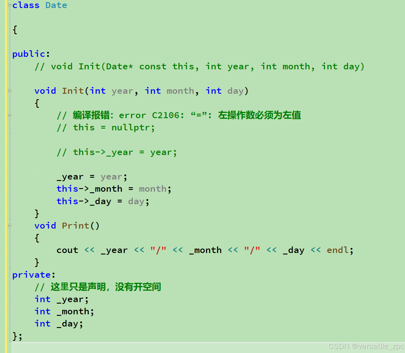Date 类中有 Init 与 Print 两个成员函数,函数体中没有关于不同对象的区分,那当 d1 调用 Init 和Print 函数时,该函数是如何知道该访问的是的 d1 对象还是 d2 对象呢? C++ 这里给了一个隐含的this 指针解决了这个问题。编译器编译后,类的成员函数默认都会在形参的第一个位置,增加一个当前类型的指针,叫做 this指针。比如 Date 类的 Inti 的真实原型为,void Init (Date* const this, int year, int month, int day) 类的成员函数中访问成员变量,本质都是通过 this 指针访问的,如 Init 函数中给 _year 赋值,this->_year = year;C++ 规定不能在实参和形参的位置显示的写 this 指针(编译时编译器会处理),但是可以在函数体内显示使用 this 指针。