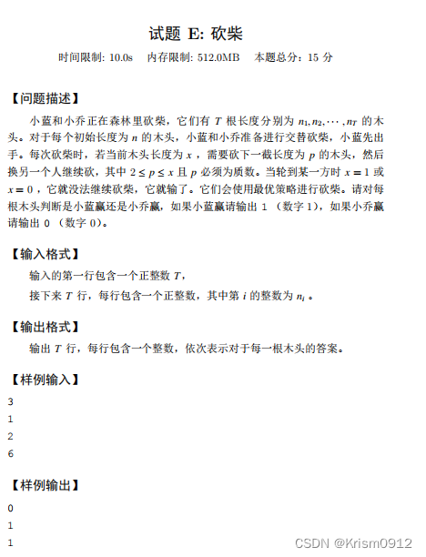 from functools import cachefrom bisect import bisect_rightdef dfs(x): # print(x) if memo[x]!=-1: return memo[x] if f[x]: memo[x]=True return True for j in range(bisect_right(a,x)-1,-1,-1): y=a[j] if not dfs(x-y): memo[x]=True return True memo[x]=False return Falsenums=[]for _ in range(int(input())): nums.append(int(input()))mx=max(nums)f = [True for i in range(mx + 1)]for i in range(2, mx + 1): if f[i]: for x in range(2 * i, mx + 1, i): f[x] = Falsea = [i for i in range(2, mx + 1) if f[i]]memo = [-1] * (mx + 1)memo[0] = memo[1] = Falsefor x in nums: if dfs(x): print(1) else: print(0) 某dotcpp网上TLE可能因为: