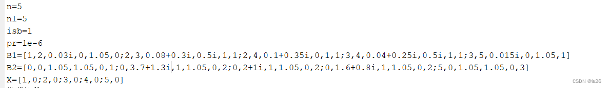 4)初始给定值矩阵B2=[0,0,1.05,1.05,0,1;0,3.7+1.3i,1,1.05,0,2;0,2+1i,1,1.05,0,2;0,1.6+0.8i,1,1.05,0,2;5,0,1.05,1.05,0,3]