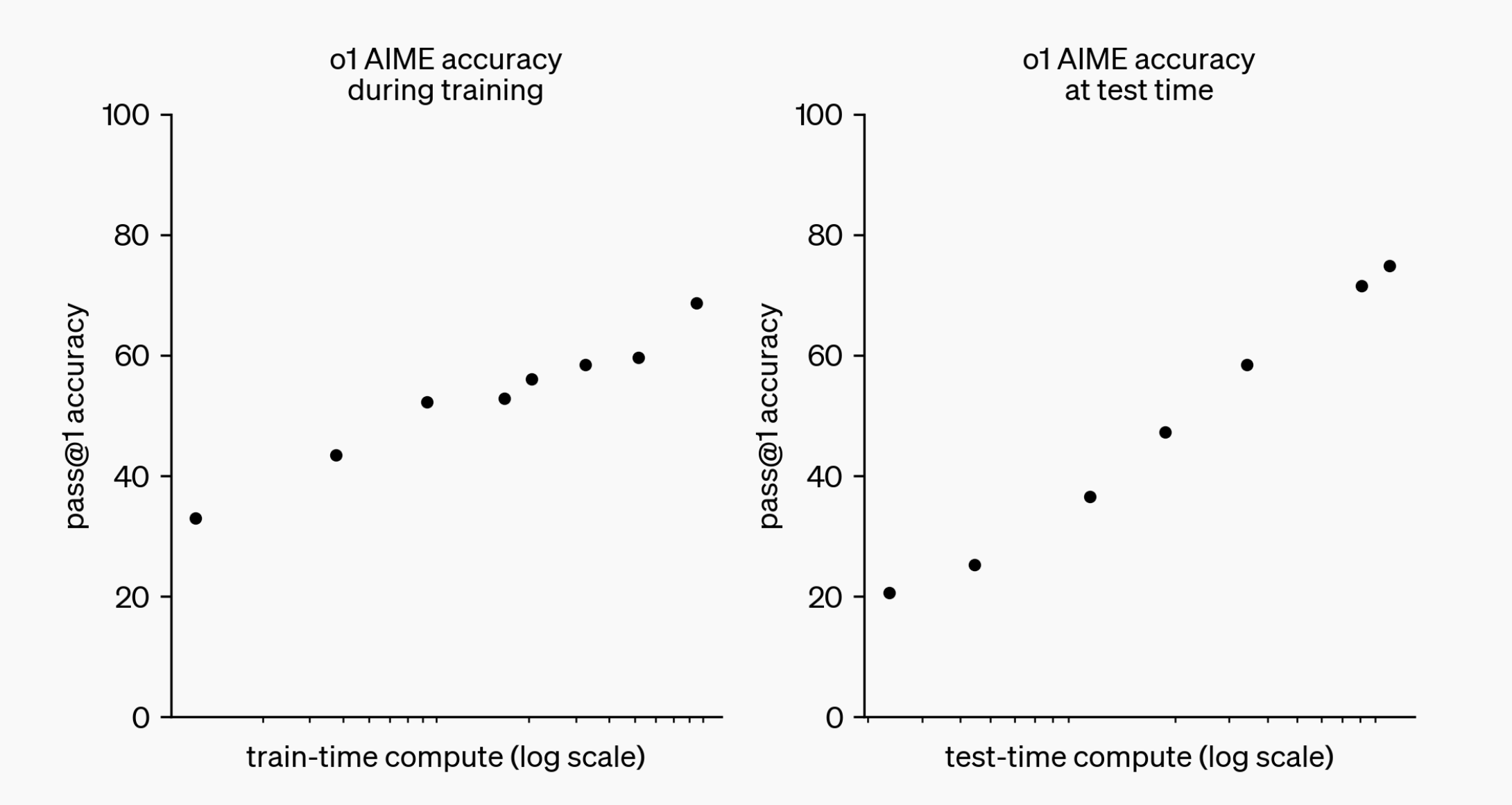 在于大规模强化学习算法教会o1如何在高质量高效数据(data-efficient)的训练过程中利用其CoT(chain of thought)的能力进行有效思考。且他们发现,随着强化学习的更多赋能(训练时间计算)和思考时间的增加(测试时间计算),o1 的性能会持续提高