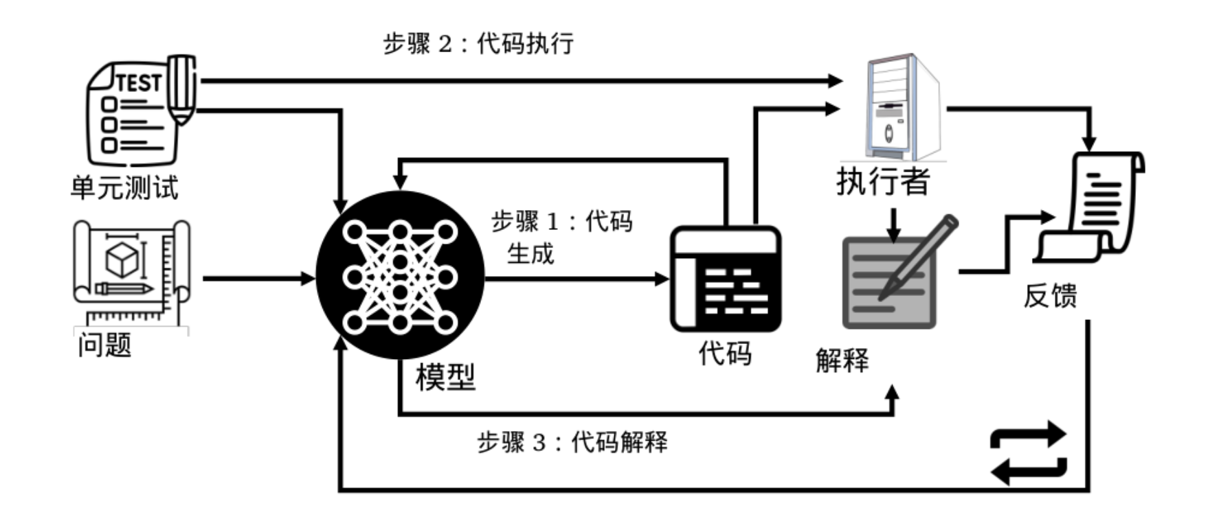 在生成步骤中,给定问题描述,模型预测候选程序在解释步骤中,模型被提示以语义上有用的方式处理预测结果,例如用自然语言解释预测,或为预测的代码创建一个示例输入的执行跟踪最后,在反馈步骤中,会生成一条关于预测代码正确性的反馈信息。这可以通过询问模型本身来确定,也可以通过单元测试外部生成当然,调试过程在反馈信息表明预测正确时终止,或者达到允许的最大调试次数时终止