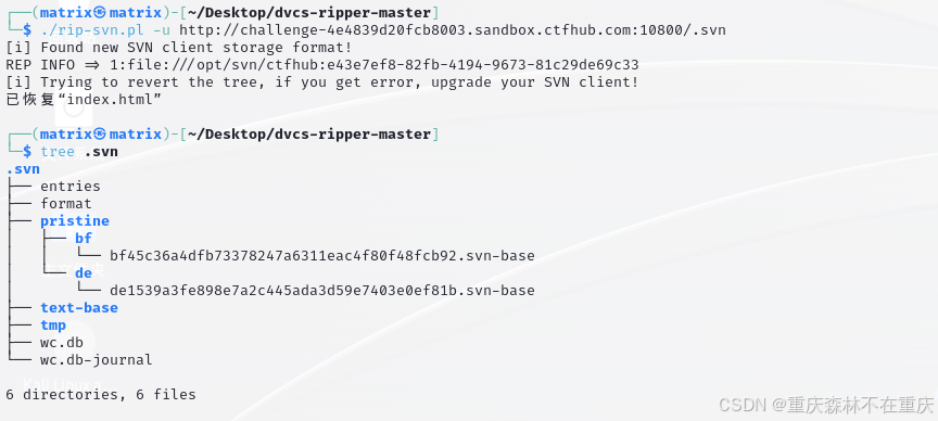 进入dvcs-ripper所在目录,使用 dvcs-ripper 中的 rip-svn.pl 脚本进行 clone,将泄露的文件下载到本地目录中。(注:要先安装工具所需依赖库)