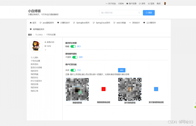 用户可在此处进行积分余额是否展示、通知、博文打赏的配置(未配置不可被打赏)