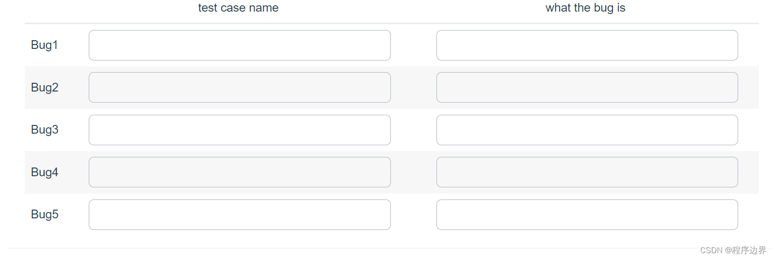 | Bug5 | Bug5: test case name | Bug5: what the bug is |