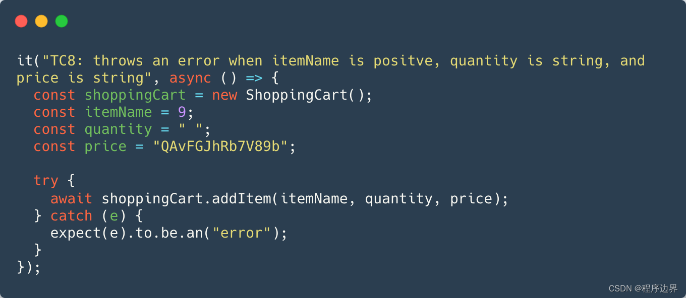 addItem(itemName, quantity, price) { this.validateInput(itemName, quantity, price); const existingItem = this.findItem(itemName); if (existingItem) { existingItem.quantity += quantity; } else { this.items.push(new ShoppingCartItem(itemName, quantity, price)); } return this;}removeItem(itemName, quantity) { this.validateInput(itemName, quantity, 0); const existingItem = this.findItem(itemName); if (!existingItem) { throw new Error("Item does not exist"); } if (existingItem.quantity < quantity) { throw new Error("Invalid quantity"); } else if (existingItem.quantity === quantity) { this.items = this.items.filter((item) => item.productName !== itemName); } else { existingItem.quantity -= quantity; } return this;}validateInput(itemName, quantity, price) { const errors = []; if (typeof itemName !== "string" || itemName.length === 0) { errors.push("Invalid item name"); } if (typeof quantity !== "number" || quantity < 0) { errors.push("Invalid quantity"); } if (typeof price !== "number" || price < 0) { errors.push("Invalid price"); } if (errors.length > 0) { throw new Error(errors.join(", ")); }}findItem(itemName) { if (typeof itemName !== "string" || itemName.length === 0) { throw new Error("Invalid item name"); } return this.items.find((item) => item.productName === itemName);} After reading the source code, you may have a complete understanding of the inputs, outputs, and operational logic of these two methods. Do you agree that * the test suite provided earlier effectively serves as “live” documentation that helps you understand these two methods better.