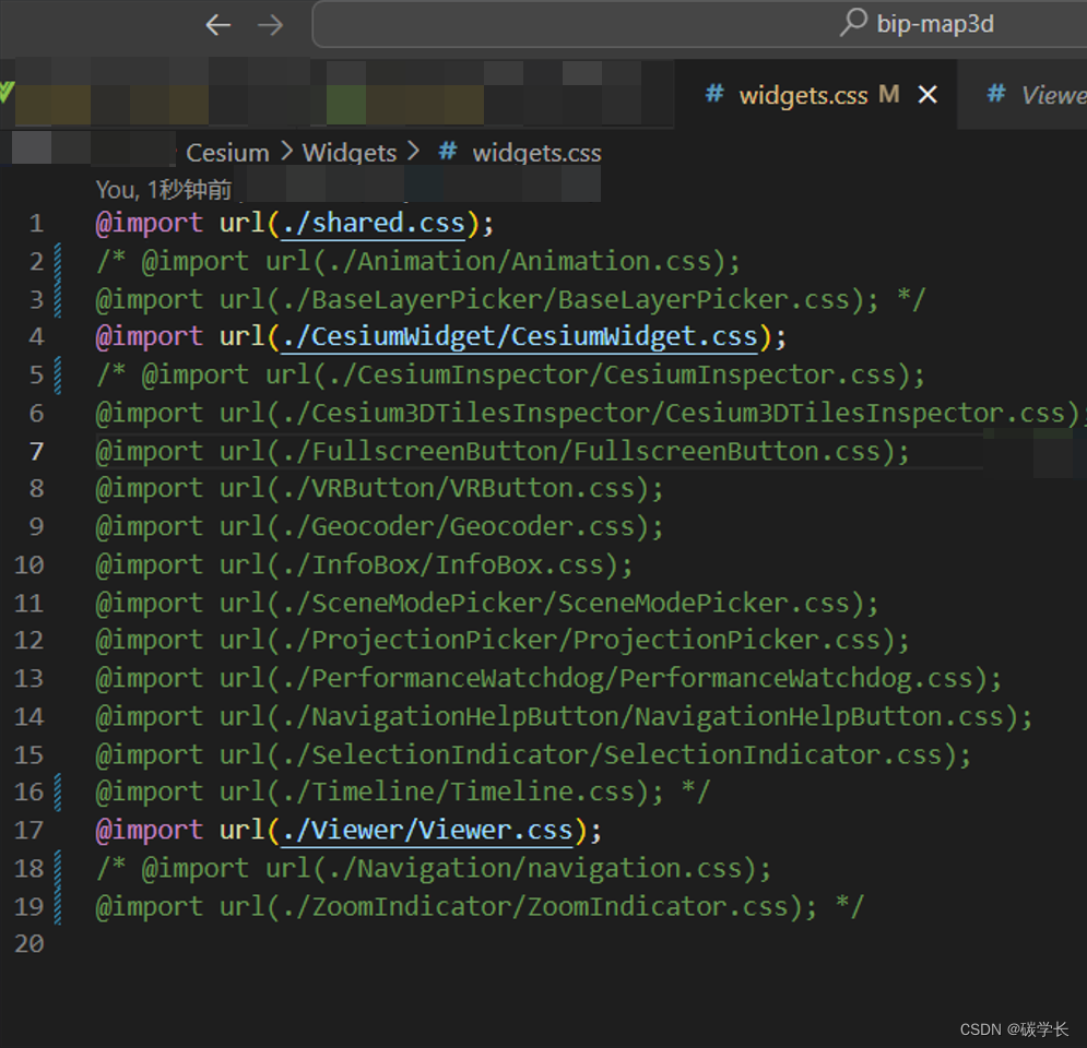 使用 Cesium 时,一般会直接引入 widgets.css,而 widgets.css 中引入了较多的 css 及其相关的各类资源,而实际场景中,并不完全需要所有的 css,因此可以尝试如下图所示的例子,屏蔽不需要的 css,从而减少资源在地图初始化时的加载,进而提升性能。