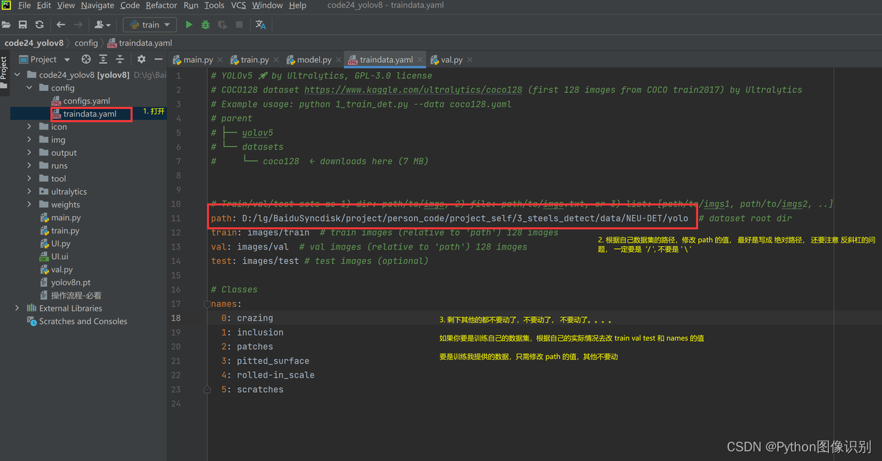 # 文档中对参数有详细的说明model.train(data=data_path, # 数据集 imgsz=640, # 训练图片大小 epochs=200, # 训练的轮次 batch=2, # 训练batch workers=0, # 加载数据线程数 device='0', # 使用显卡 optimizer='SGD', # 优化器 project='runs/train', # 模型保存路径 name=name, # 模型保存命名 ) 修改traindata.yaml文件, 打开 traindata.yaml 文件,如下所示:
