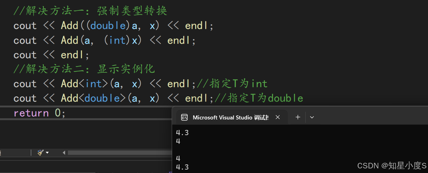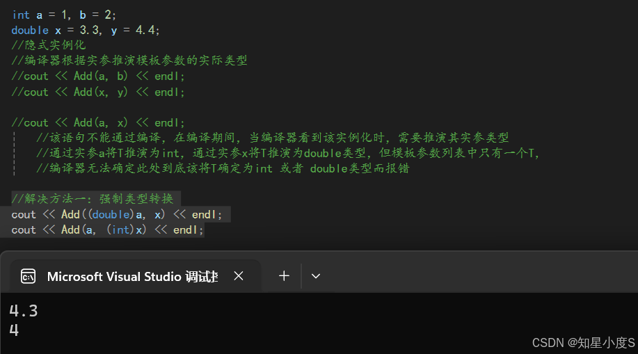 //解决方法二:显示实例化cout << Add<int>(a, x) << endl;//指定T为intcout << Add<double>(a, x) << endl;//指定T为double